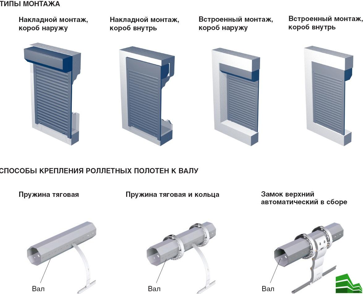 Роллетные группы с калиткой или без неё, могут монтироваться внутри или снаружи строения. Внутренний монтаж является самым распространенным, он будет лучшим образом обеспечивать защиту от проникновения внутрь злоумышленников.