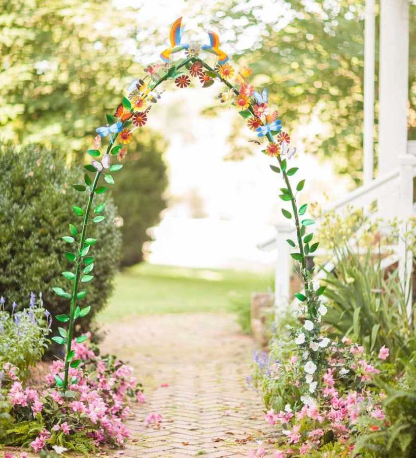 На фоне дуговидной арки из цветов интересно смотрятся клематисы, глицины, розочки плетистого типа. Для изготовления потребуется всего пара отрезков толстой проволоки или труб, кусок сетки с покрытием из пластика. Подвязали к опорам – и все, готово!