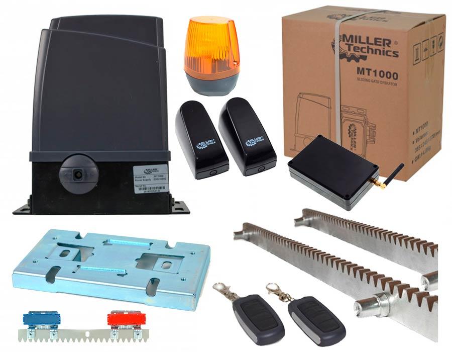 MILLER TECHNICS 1000. Модель для откатных ворот. Отличается простотой монтажа и длительным гарантийным сроком работы (10 лет и более). В комплект входит 4-х канальный пульт ДУ, фотоэлементы безопасности и GSM-модуль.
