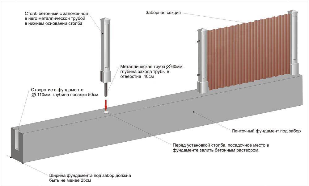 Принцип монтажа аналогичен способу установки металлических столбов. Однако эту операцию следует производить при более глубоком бетонировании — допустимый минимум составляет 120 см ниже уровня грунта. С целью повышения прочности забора и его сопротивляемости высоким нагрузкам рекомендуется применять армированные изделия.