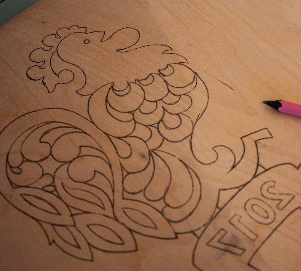 Теперь рисунок можно перенести непосредственно на обратную сторону фанеры или древесины, обводя линии карандашом или тонким маркером. Перенести чертеж на заготовку можно и при помощи копирки, также для этих целей в продаже доступна специальная самоклеящаяся бумага. При условии, что вы умеете хорошо рисовать – трафарет можно нанести на заготовку, не используя копирки.