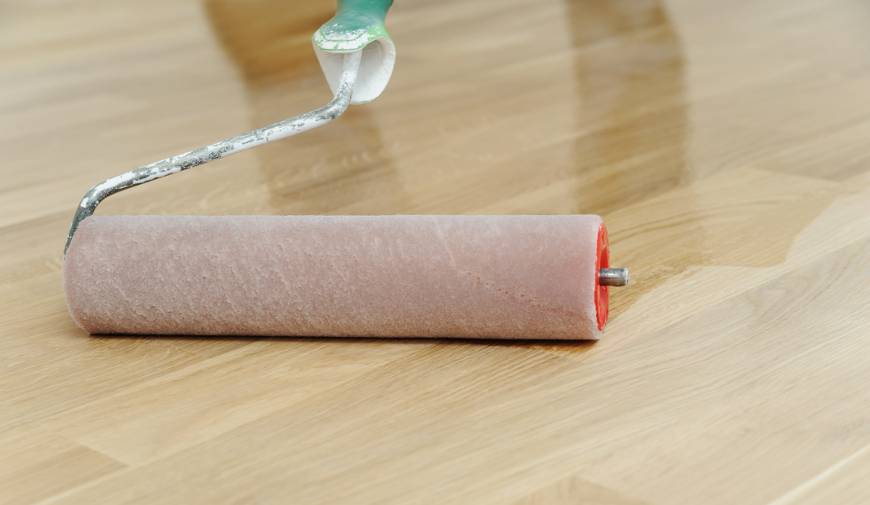 Все что нужно — это качественный лак и валик. Лак нужно наносить поперёк досок валиком, после чего поступательными движениями разравнивать вдоль.