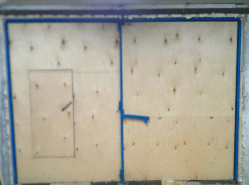 - Прикрепить пластину к полотну и вставить стопор в кольца. К железной раме приваривается изнутри. К деревянной обшивке крепится саморезами.