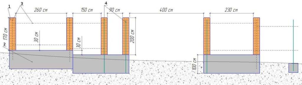 Изображение №1: схема забора с фундаментом на неровной поверхности