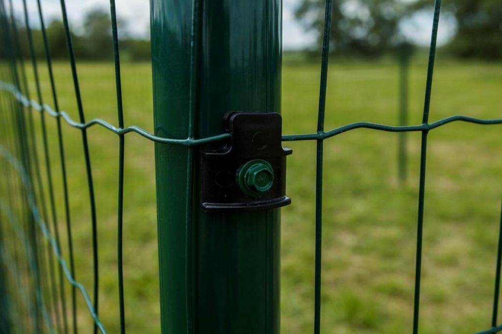 Когда полотно натянуто по всей длине вместо вязальной проволоки устанавливают хомуты или скобы. Если конец рулона пришелся на пролет, его сращивают внахлест с началом другого или обрезают излишки по последнему столбу. Чтобы не было перекосов монтаж желательно проводить с помощником.