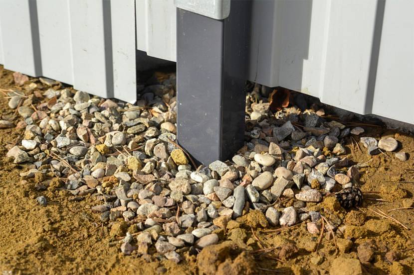Для первого устанавливается опора, а нижняя часть трамбуется, как при обычном бутовании. Если столб металлический, то его лучше забить в грунт, а оставшуюся часть бетонировать. Этот вариант уместен при установке опор для забора из профнастила.