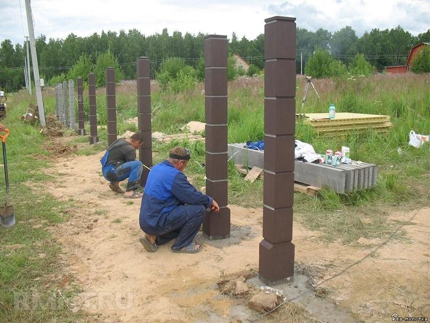 - Процесс установки таких опор занимает достаточно много времени. Необходимо выкопать ямы соответствующей глубины, приготовить бетонный раствор, произвести установку и выравнивание столбов, залить ямы раствором. На все это может потребоваться несколько дней, в зависимости от длины будущего забора.