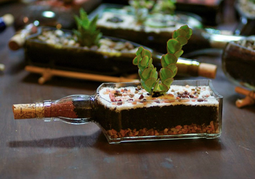 Стекло — самый экологичный материал. А еще оно очень красиво и позволяет реализовать с десяток разных идей — например, переплавить бутылки в тарелки для подачи еды, так делают даже в ресторанах. Еще можно посадить суккуленты или другие неприхотливые растения внутри разрезанных стеклянных бутылок.
