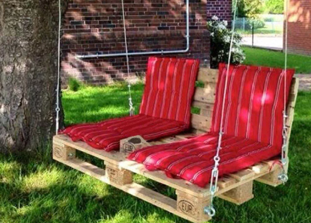 Деревянные поддоны часто используют для изготовления разнообразной мебели. Но из них получаются и отличные качели для сада. Для изготовления качелей поддоны надо вычистить и окрасить.