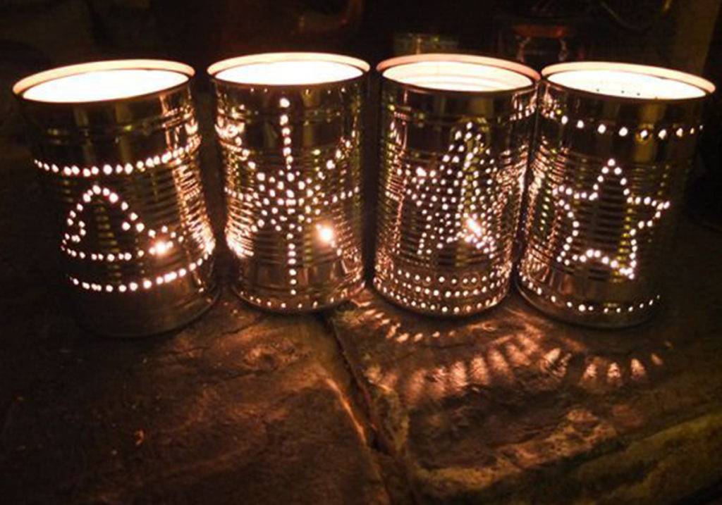 Из консервной банки можно сделать не только цветочный горшок или походную пепельницу. Самое простое — взять гвоздь и пробить молотком на корпусе банки узор, а внутрь поставить свечу или собрать разбросанные по квартире ручки и карандаши. Самый ленивый вариант — использовать под свечи алюминиевые крышки.