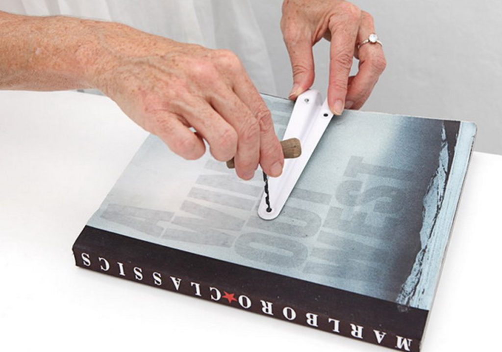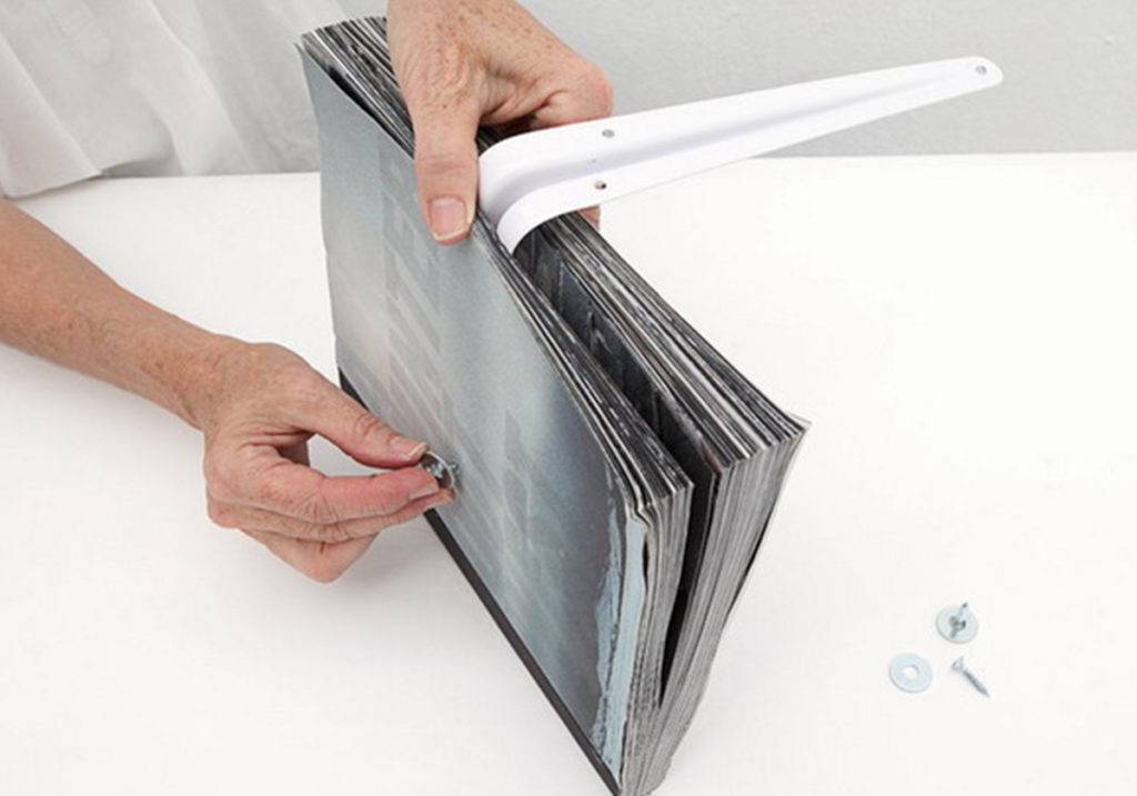 Другой вариант: возьмите кронштейн с тремя отверстиями, три винта с шайбами, три дюбель-шурупа, дрель и отвертку. Наметьте и просверлите три дырки в книге так, чтобы одна из них приходилась на ее середину. Вложите кронштейн между страницами, в готовое отверстие поместите винт с шайбой, а с другой стороны прикрутите вторую шайбу. Плотно закрутите винт отверткой. Повторите то же самое с другими отверстиями. Теперь можно крепить к стене!