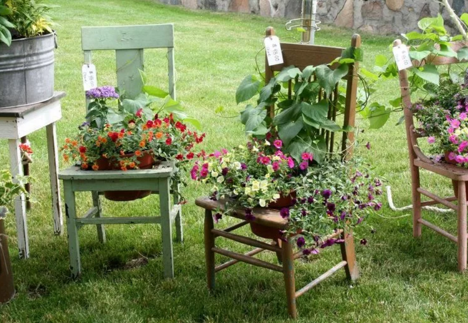 Аналогичным образом можно поступить с телегой. По такому же шаблону легко использовать ненужную стремянку. Интересный цветник получится, если в качестве вазонов задействовать старые сумки.