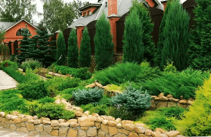Декоративный сад для оформления территории вдоль забора хвойными мини-культурами Источник roomester.ru