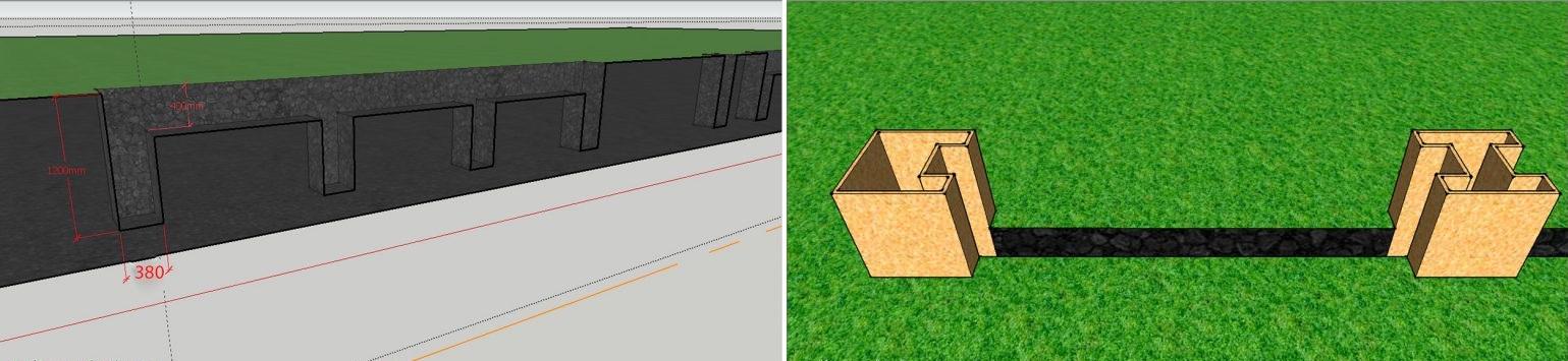 На очереди заливка цоколя. Обклейте пазы десяти-пятнадцати миллиметровым пенополистиролом и выставьте из OSB опалубку, она должна быть на 30-50 мм ниже высоты тумбы. Дальше организуйте в траншеях 25-сантиметровую песчаную подушку и установите из восьмой арматуры каркас