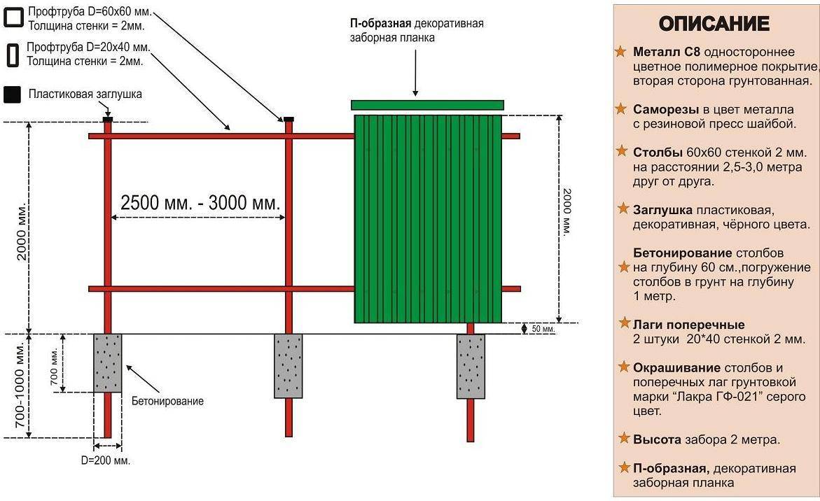 Для постройки металлического забора обычно выбирают конструкции из профлиста. Они создаются в несколько этапов.