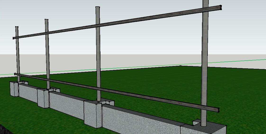 Демократичный вариант секции. Сетка рабица в этом случае закреплена в специальной железной раме. Рама приваривается к столбам с помощью заранее установленных металлических пластин.