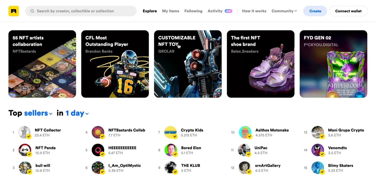 Rarible — это торговая площадка NFT, которая использует собственный токен RARI как платформу, ориентированную на создателей. Любой пользователь может легко создать NFT для уникальных цифровых предметов вместе с полнофункциональной криптовалютной площадкой. Они используют часть выручки для субсидирования первой транзакции монетного двора, где NFT создается для стимулирования роста платформы.