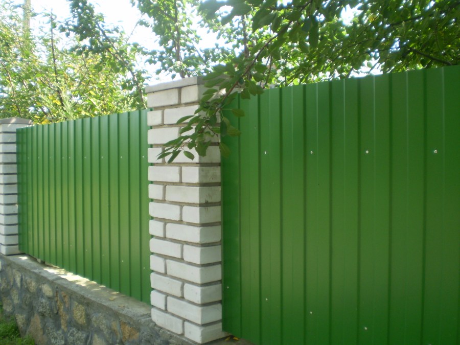 Они могут иметь толщину 0,45-0,5 мм. Поскольку ограждение несет и декоративную функцию, есть смысл покупать окрашенный профнастил. Он более эстетичный, чем оцинкованный, а еще более долговечный