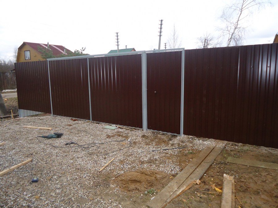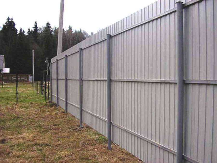 Отсутствие фундамента ускоряет монтаж ограждения и позволяет сэкономить средства на покупку бетона. Такой вариант конструкции уместен, если на участке нет существенных перепадов по высоте, почва не является водянистой, а местность не подвержена воздействию сильного порывистого ветра. В этом случае сперва устанавливаются столбы. Опоры заглубляют на расстояние не менее 1,5 м, а дно ям заполняется гравием или осколками кирпича. Столбы выравниваются с помощью отвеса и заливаются цементным раствором. После этого устанавливаются поперечные лаги и осуществляется крепление металлических листов.