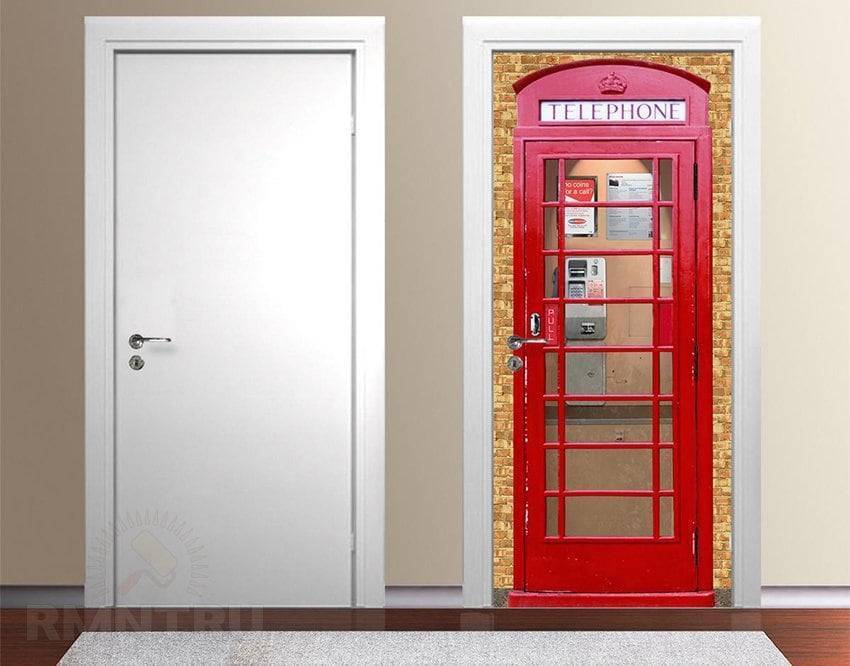 Поверхность межкомнатной двери необходимо подготовить так же, как и в случае с покраской или тонировкой. Плёнку или шпон вырезают по размеру дверного полотна, делая припуск до 3 см. Далее начиная с одного края, приклеивают материал. Если используется самоклеящаяся плёнка, то с неё постепенно снимается защитная бумага по мере наклеивания на поверхность двери.
