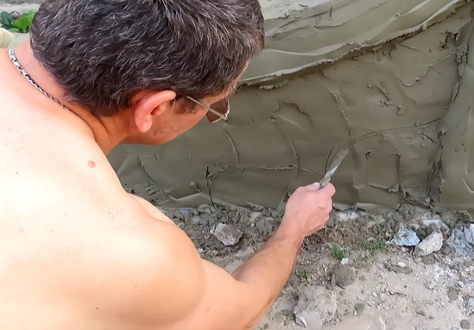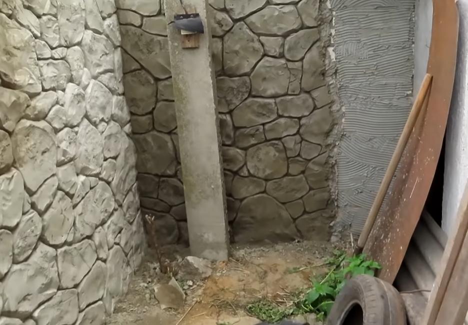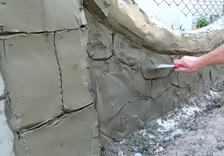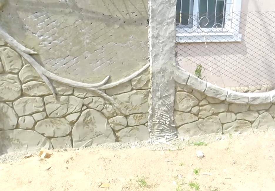 - когда послойное нанесение материала завершено, приступают к формовке рельефа — создают столбы, придают им форму кладки из валунов или рваного камня, создают фигуры или барельеф.