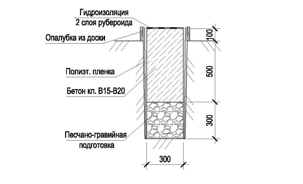 Диаметр скважины должен на 3-4 см превышать диаметр ранее изготовленного столба. После помещения столбов в скважины, оставшееся незаполненным место возле них засыпают грунтом, что обеспечивает надёжную фиксацию фундамента.