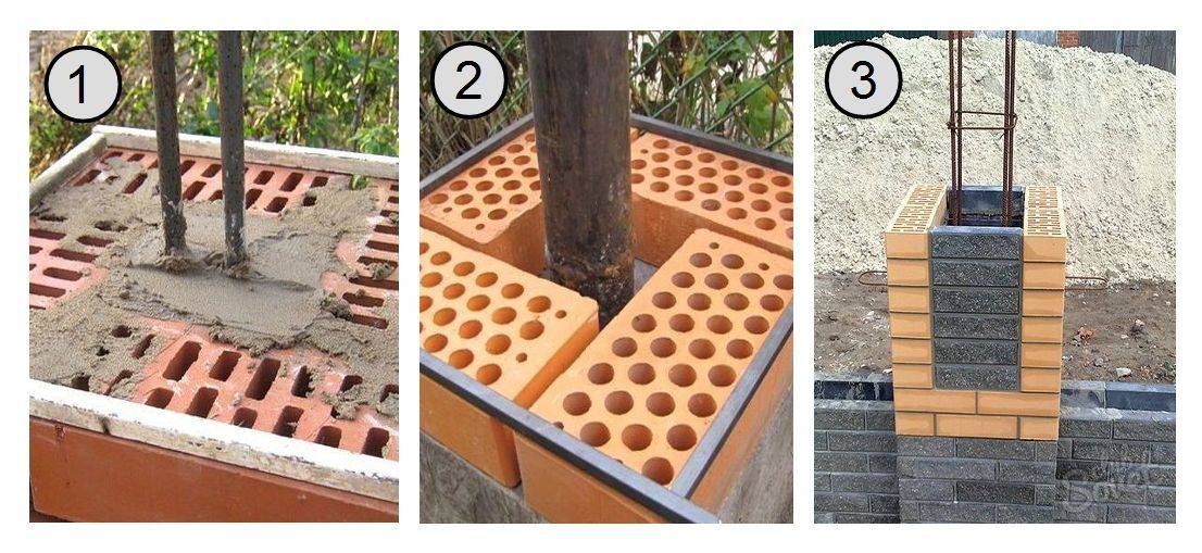 Важно учесть, что основание кирпичного столба в первых 2—3 рядах рекомендуется выложить из полнотелых блоков. А 3-й ряд и выше можно обложить кирпичиками с пустотами либо сформировать порядовку из облицовочного кирпича