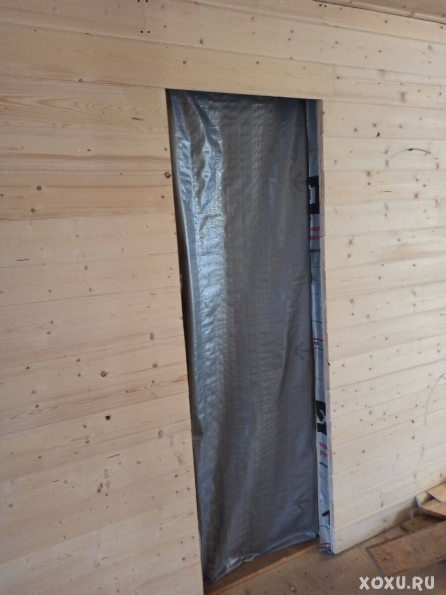 Давайте покажу фото на этапе отделки, где уже установлена эта дверца. Её никто не видит, она находится в гардеробной второго этажа, и сливается с деревянной стеной. В одной из статей блога, расскажу – как обшивалось это помещение. Не пропустите…