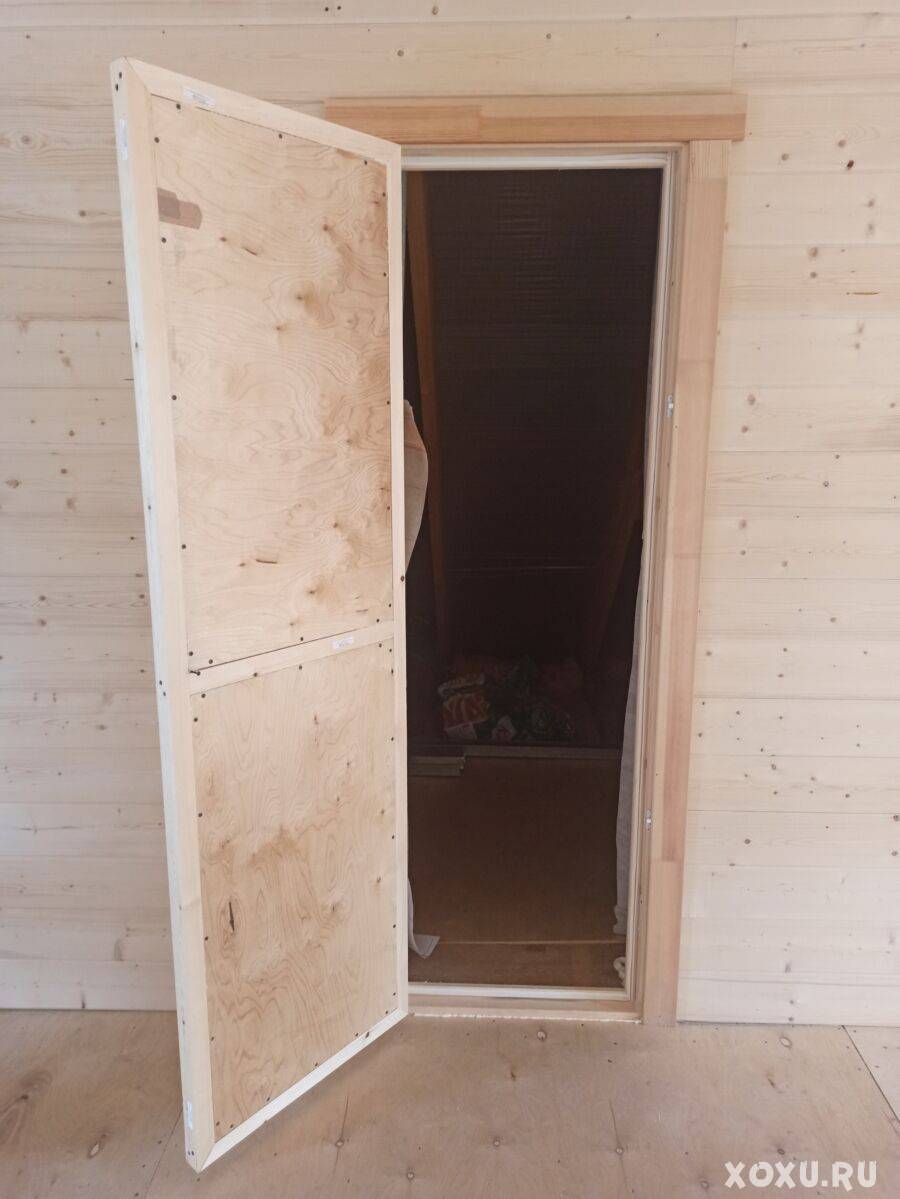 На этом самодельная деревянная дверь готова. Остается лишь смонтировать необходимую фурнитуру и установить дверь в подготовленный проем.
