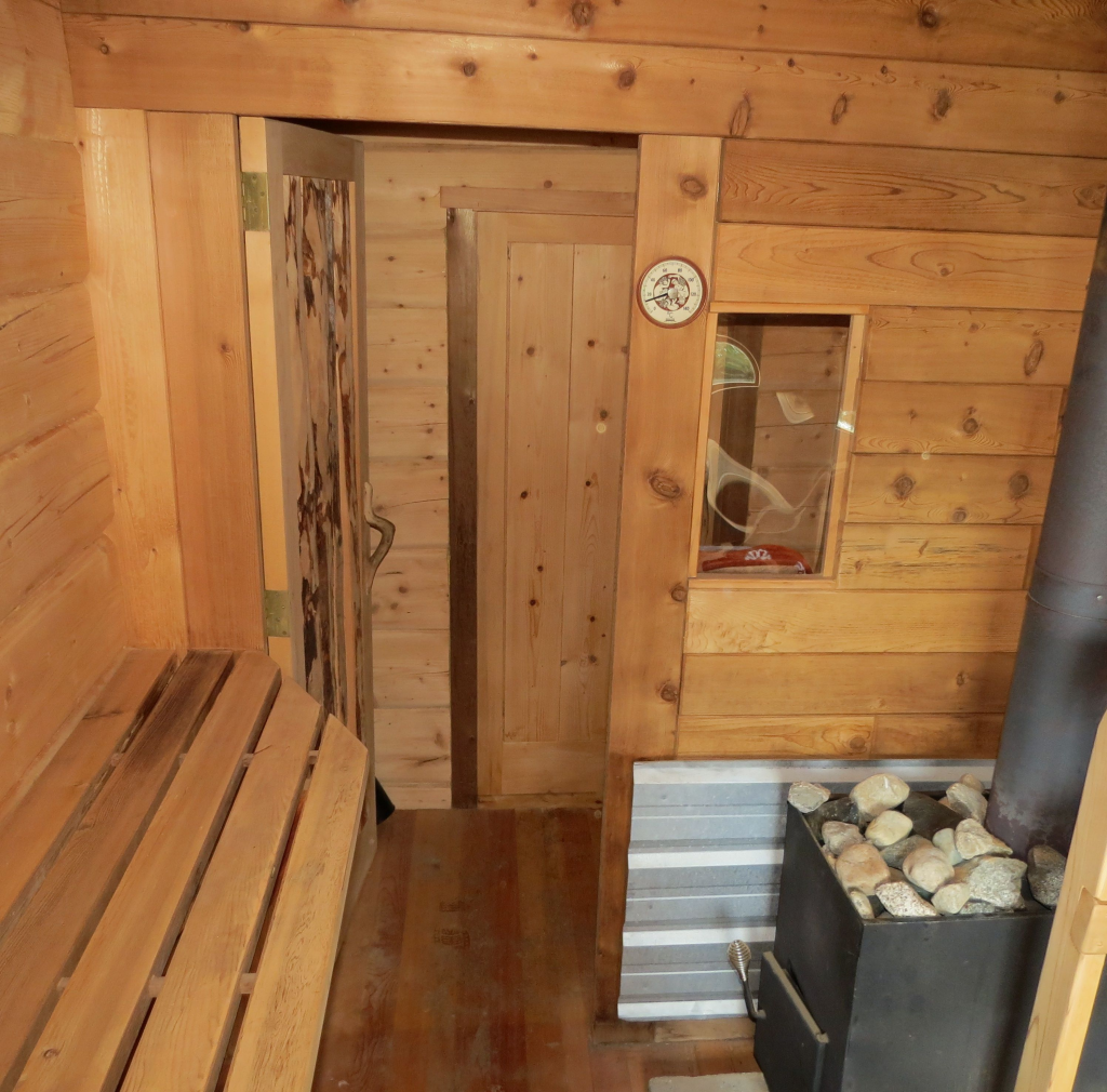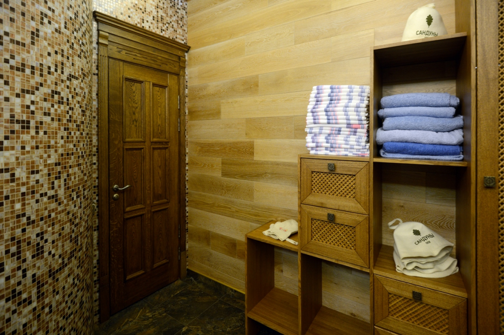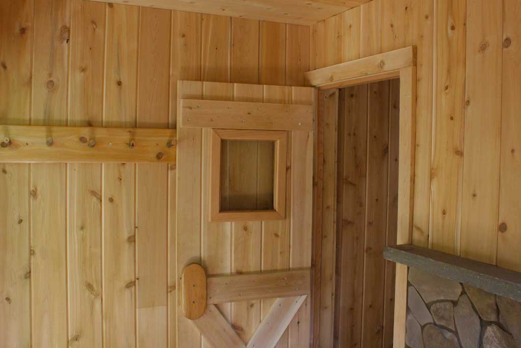 Входная дверь в баню из дерева защищает от взлома и сохраняет климат внутри помещения. Выбор отделки входных и межкомнатных створок довольно большой. Есть современные модели из комбинированных материалов с закалённым стеклом. В качестве наполнителя идеально подходит негорючая и нетоксичная базальтовая вата. Чтобы предохранить утеплитель от влаги и горячего пара, под обшивкой на него натягивают плёнку. В более простых межкомнатных моделях используют сотовый материал из картона или ДВП. Чаще всего для входной группы выбирают щитовые и каркасные двери, а в качестве межкомнатных (предбанник, комната отдыха) достаточно хорошо справляются филенчатые.