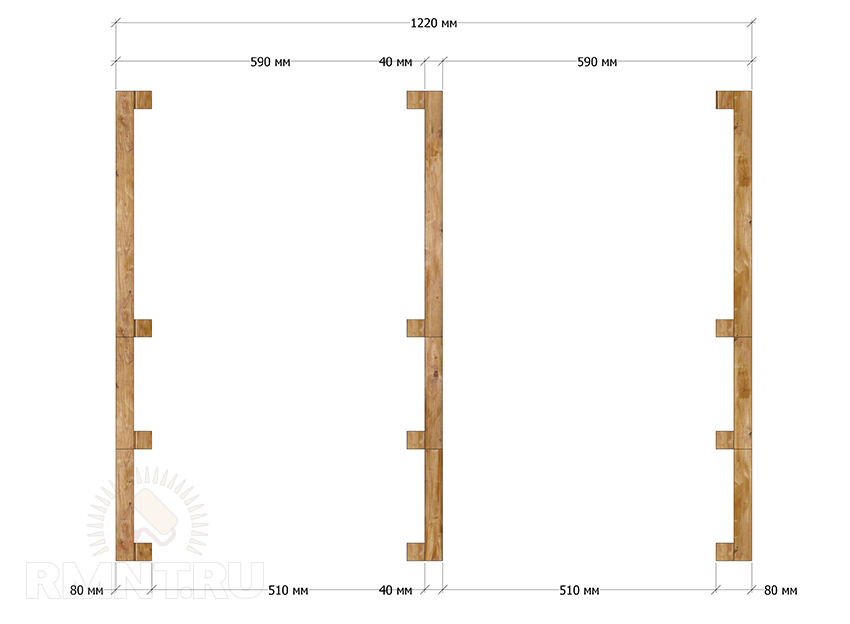 Длина ступеней составляет 1300 мм, с обеих сторон необходимо отступить по 40 мм, 1300 – 80 = 1220 мм, именно на таком расстоянии должны стоять крайние несущие каркасы. Средний каркас выставляется ровно посередине.
