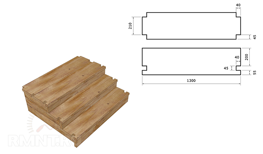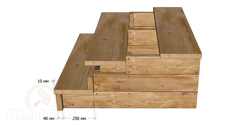 Ширина каскада для ступени равна 250 мм, прибавим к ней толщину подступни 40 мм и получим 290 мм, а так как ширина ступени равна 300 мм, то она должна выступать из каркаса ровно на 10 мм.
