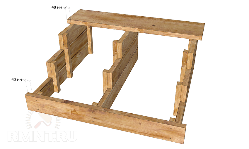 Для того чтобы при закручивании шурупы не упирались друг в друга, верхние ступени крепятся в горизонтальные рёбра досок каркасов, а подступни — в вертикальные бруски.