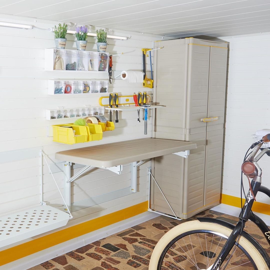 сделайте мастерскую, установив складной стол, полки, лотки и шкафы для инструментов;