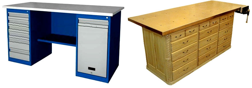 Главное оборудование любой домашней мастерской – верстак. Он бывает столярный или слесарный. Первый больше ориентирован для работ с деревом, второй – с металлом. Если иметь дело придется с обоими материалами, то, скорее всего, понадобится 2 стола. В любом случае следует учитывать, что у слесарного верстака размеры меньше, чем у столярного. Его ширина обычно составляет 0,5–1 м при длине 1–1,5 м.