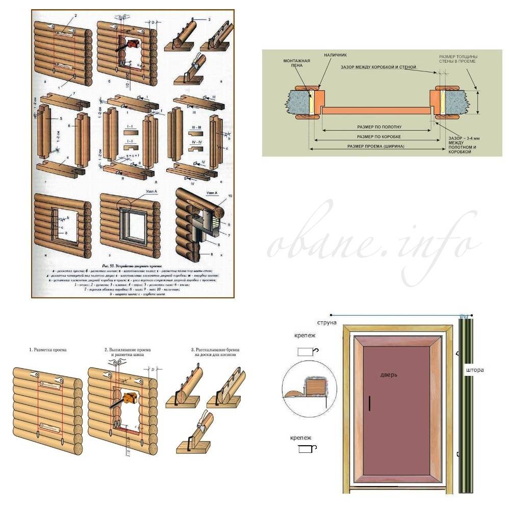 Ширина проема должна быть на 16 см больше ширины дверного полотна, так как толщина коробочного бруса обычно 3 см, а бруса для косяка — 5 см;
