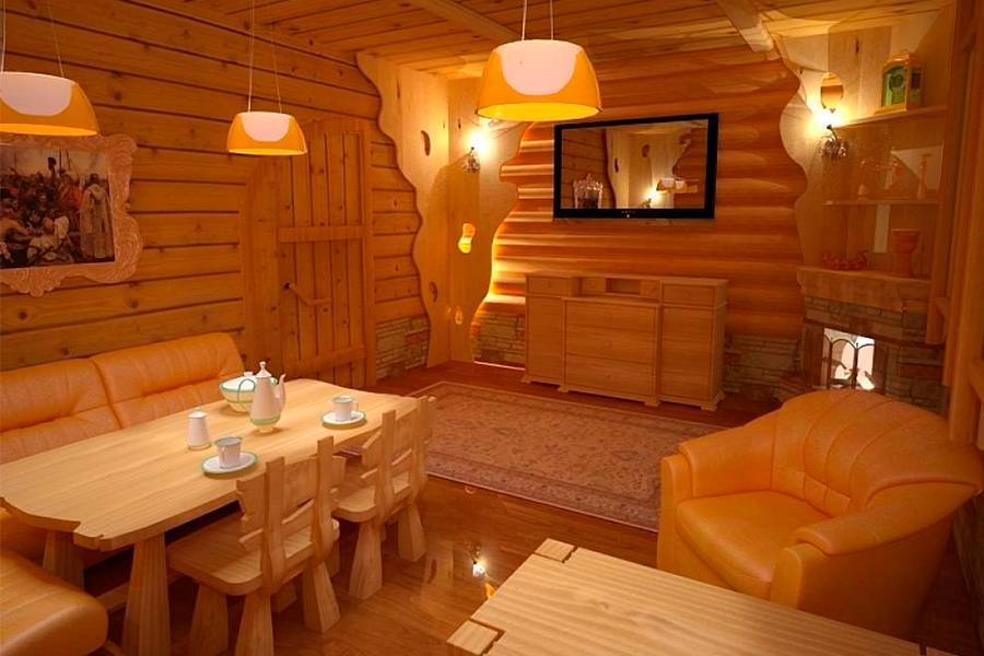 Температура в комнате отдыха не поднимается до критических отметок и влажность в этом помещении низкая. Поэтому для отделки предбанника подойдет любой вид древесины.