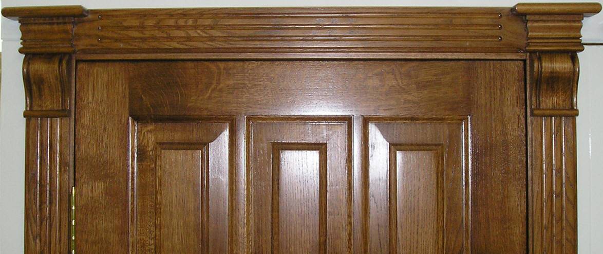 Дверной блок из массива собирается из небольших фрагментов, которым заранее придана необходимая форма. Каждая деталь тщательно обрабатывается и подгоняется друг к другу. Технология изготовления напоминает процесс сборки филенчатой двери – цельные либо склеенные детали монтируются на деревянную раму.