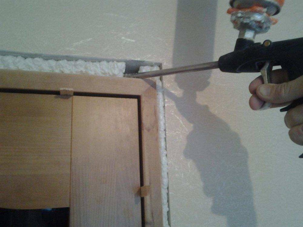 Всё расстояние между коробкой и проёмом нужно запенить монтажной пеной. Дело это нехитрое и интересное, главное запенить всё пространство и после подсыхания и срезать пену ножом.