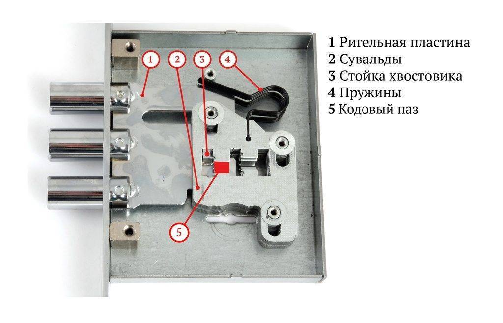 Работа сувальдного замка основывается на выставлении пластин, носящих название сувальды в определенном порядке. Устройство дверного замка сувальдного типа включает в себя: