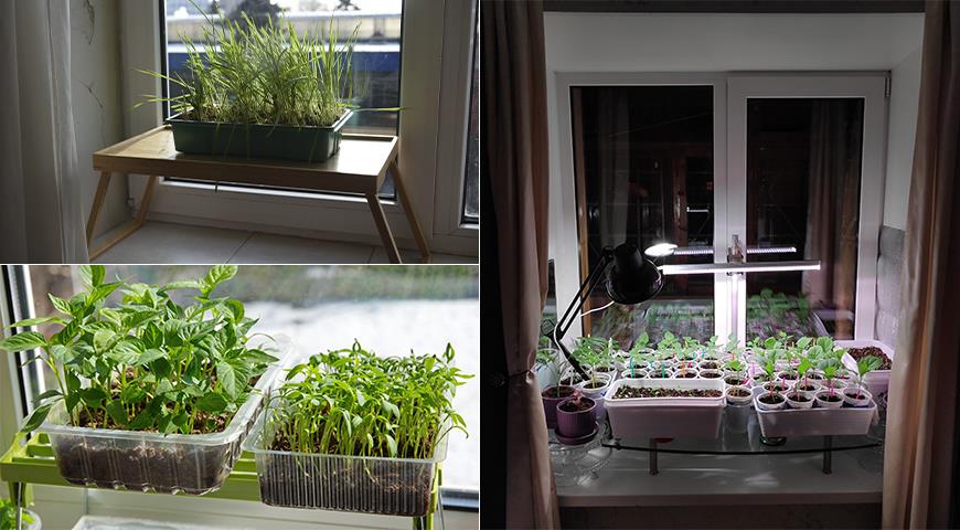 Если речь идет о небольшом количестве рассады, которое надо просто временно “оторвать” от холодного зимнего подоконника, то тут можно использовать любой подручный материал: кроватные столики-подносы, пластиковые легкие полки для кухни и ванной, на крайний случай старые коробки и даже не нужные книжки.
