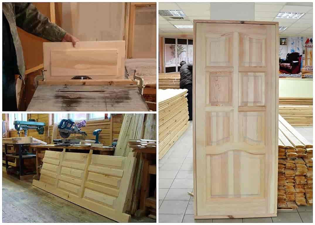 Обработка поэтапная. Наносят грунтовку в 2-3 слоя, после чего покрывают лаком. Комбинирование натурального дерева проводят с МДФ, ДВП, ДСП. Сверху покрытие делают из ПВХ. Внутри полотно пустотелое. Иногда применяют такие материалы, как гофрокартон, деревянные брусья, ДСП.