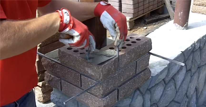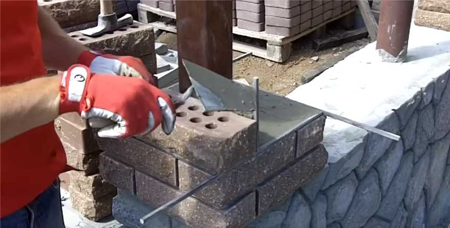 Описанная выше кладка столбов давно проверена, но новичкам, при самостоятельном изготовлении, тяжело выдерживать ровный шов. Еще проблема — раствор вылезает из шва, пачкая поверхность. Получается не очень красиво. Для облегчения работы придумали кладку под пруток. Берут квадратный металлический пруток со стороной 8-10 мм, нарезают его не куски, на 10-15 см длиннее размеров столба.