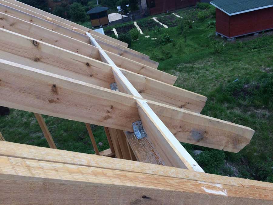 На мауэрлат монтируют готовые фермы из стропил. Для их фиксации в брусьях мауэрлата с шагом до 1,5 м изготавливают специальные пазы. Впоследствии в них вставляют нижние части стропильных ног и дополнительно скрепляют с обвязочным брусом. При этом окончания стропил должны выходить за каркасный дом 5х6 примерно на 30-40 см.