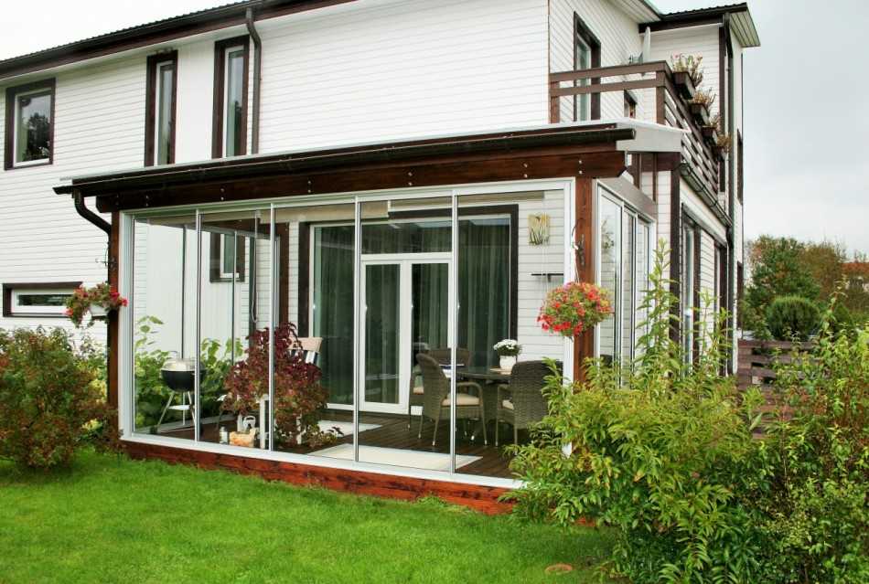 - Утепление и остекление террасы (данный приём переводит террасу в категорию внутренних полезных помещений; на тёплой террасе, защищенной от осадков, ветра и насекомых можно оборудовать столовую, кабинет или круглогодичную кухню).