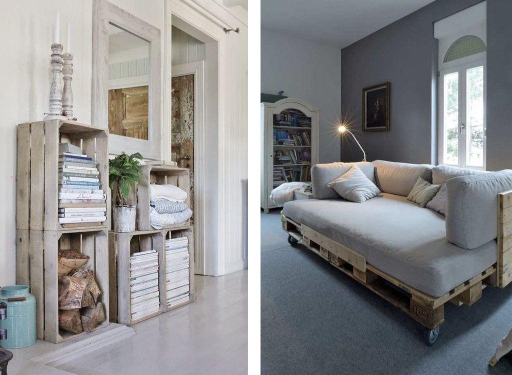 Небольшой низкий диванчик подойдет больше для уединенного отдыха. Иногда так приятно почитать хорошую книгу или полистать журнал в компании себя любимого! А чтобы было где хранить литературу, можно соорудить стеллажи из паллет или ящиков. Кстати, такие модульные конструкции легко переделать или вовсе убрать, если потребуется.