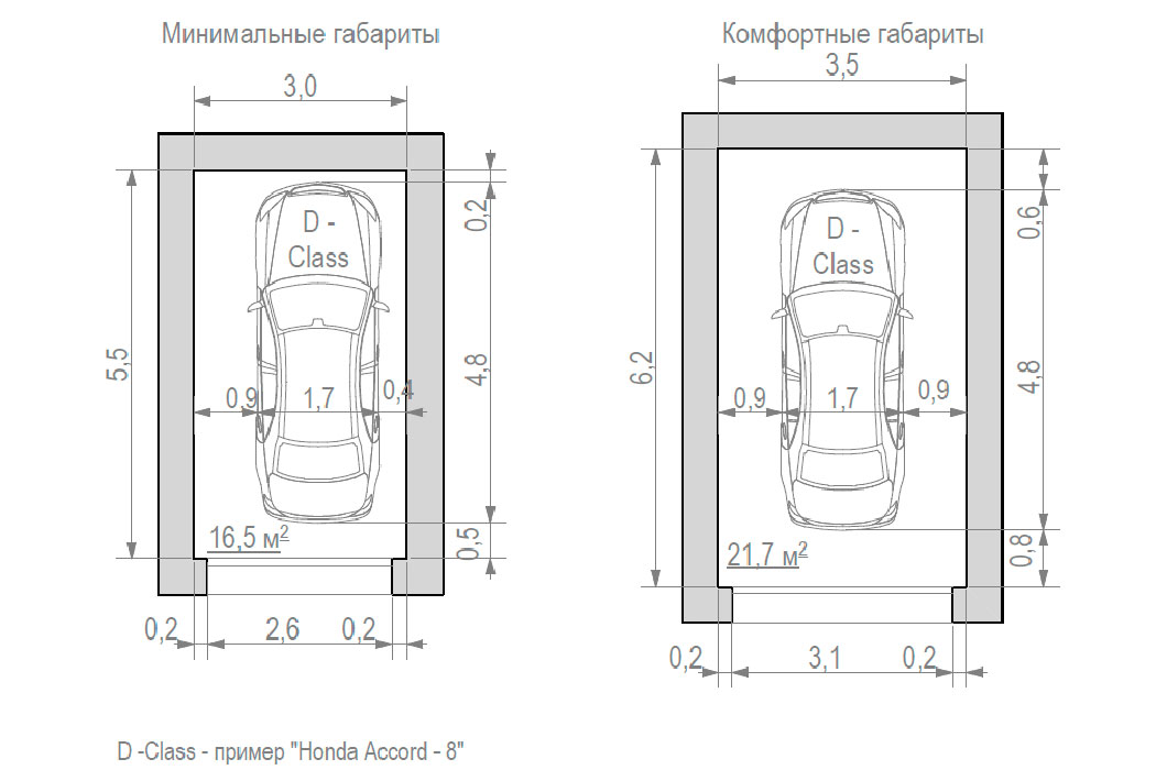 Гараж для 1-ой машины Минимальный размер гаража — 3 х 5,5 м, однако для более комфортного содержания автомобиля чаще используется размер 4,5 *6 (7) м с высотой 3 м.