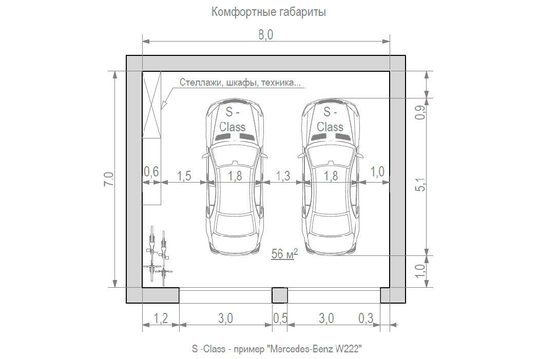 Гараж для 2-х машин Наиболее комфортные габариты с точки зрения открывания дверей и дополнительного пространства для хранения шин и прочих крупногабаритных предметов – 7*8 м.