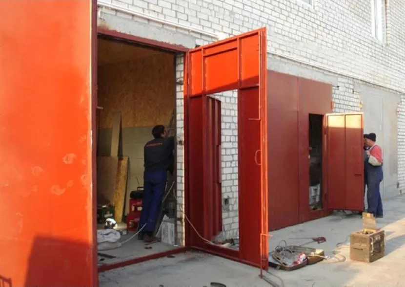 Полотно разрезают на 2 равные части, при помощи болгарки удаляют торчащие куски трубы. Для укрепления створок можно установить дополнительные горизонтальные или диагональные поперечины. Все сварочные швы зачищают, конструкцию красят и устанавливают на петли. Для предотвращения открывания дверей внутрь, к верхней части рамы наваривают контрольную профильную трубу, которая будет ограничивать их ход.