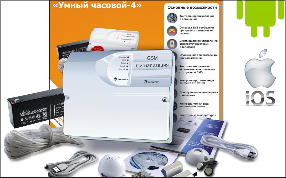 В стандартный комплект большинства охранных GSM систем входят главный блок (сюда устанавливается сим-карта, с которой и будут отправляться сообщения) с зарядным устройством, датчик движения, датчик открытия дверей, сирена и два брелока.